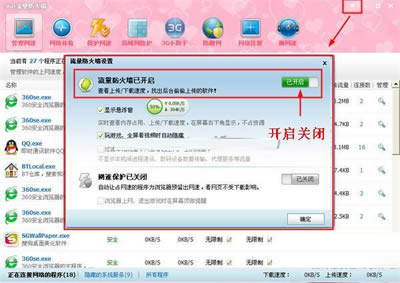 3、点开360流量防火墙右上方的小箭头按钮,打开流量防火墙设置,开启流量防火墙,勾选“显示悬浮窗”。