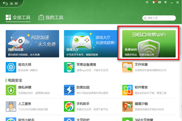 第二步、在“全部工具”处找到“360免费WifI”并点击。