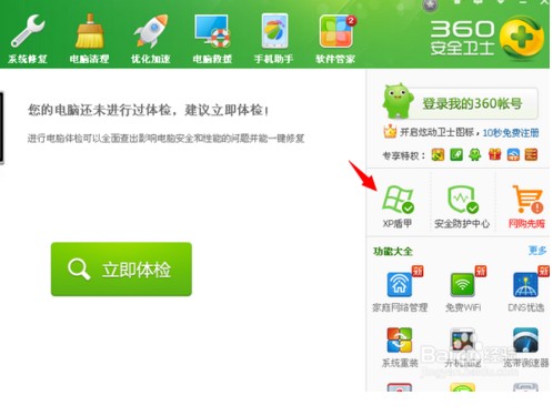 安装完成后,您会发现主界面会与普通版的360安全卫士有所不同,新增的360XP盾甲专门针对Windows XP用户提供,为XP系统保驾护航。点击右边功能大全上侧的“XP盾甲”,如图所示。