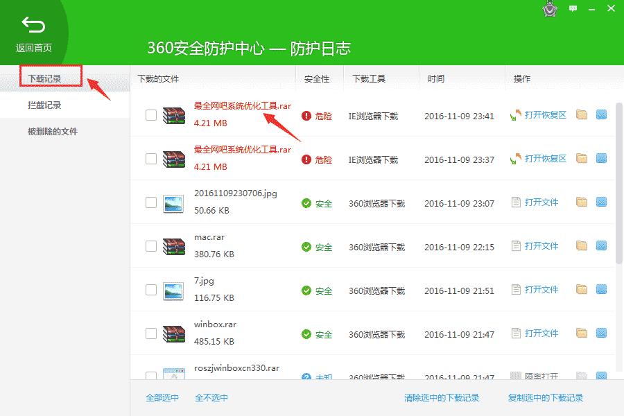 点击 下载记录 即可在右侧看到刚刚被360删除的文件