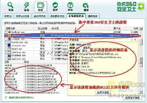 查看系统进程的详细情况,可以了解当前系统中是否存在可疑进程,360安全卫士还提供显示了进程所加载的DLL等所有模块,从而给用户判断系统当前安全状态提供了更多的帮助和依据。