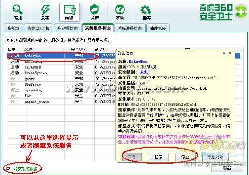 1、先单击“高级”→“系统服务状态”,进入系统服务状态界面,等待程序读取完所有的系统服务状态,可以通过选中或不选中界面左下方的“隐藏系统服务”来决定是否显示操作系统自带的服务。