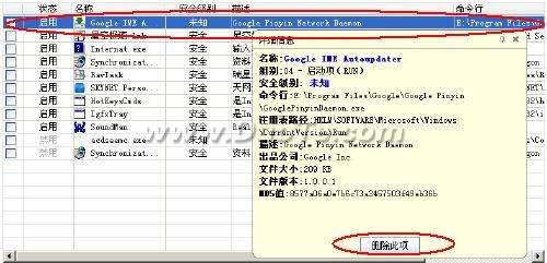 2、检查列表中显示的启动项,单击选中一个选项,则可以查看该项的详细信息,如下图所示。如果该项属于不必要的启动项目,可以单击详细信息页下方的“删除此项”,把该启动项删除去。