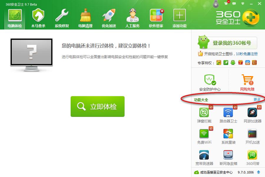 1、打开360安全卫士点击右下角《功能大全》中的《流量防火墙》,这样360加速球就会自动打开了。如果在360安全卫士的首页没有看到流量防火墙就在功能大全的更多种查找。
