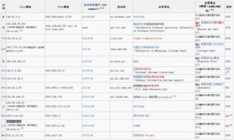 根域名服务器(root name server)是互联网域名解析系统(DNS)中最高级别的域名服务器,全球仅有13台根服务器。其中,主根服务器(A)美国1个,辅根服务器(B至M)美国9个,瑞典、荷兰、日本各1个。13台根服务器详细信息如下图所示: