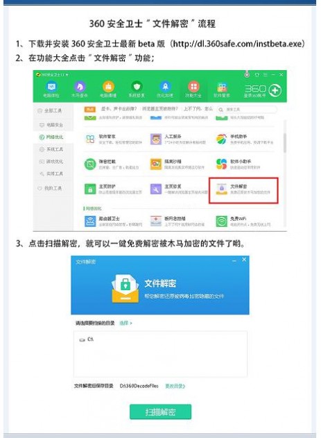 近期,新型敲诈者病毒“纵情文件修复”大规模爆发,360安全卫士在2月6日晚7点国内首家发布预警并率先拦截该病毒。为了帮助电脑裸奔用户和使用其他杀毒软件而不慎中招的用户修复文件,360安全卫士最新Beta版特别提供了“文件解密”功能,可以一键恢复被“纵情文件修复”病毒加密的文件。