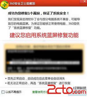 360安全卫士系统蓝屏修复向导怎么使用:1.启用系统蓝屏修复功能后,您就可以放心打补丁,并不需要再进行任何操作或设置。当360漏洞修复程序发现有可能会打蓝屏或造成系统无法启动的微软补丁时,会自动帮您备份相关的系统文件,并在打补丁结束后提示您本次打了几个系统内核补丁。