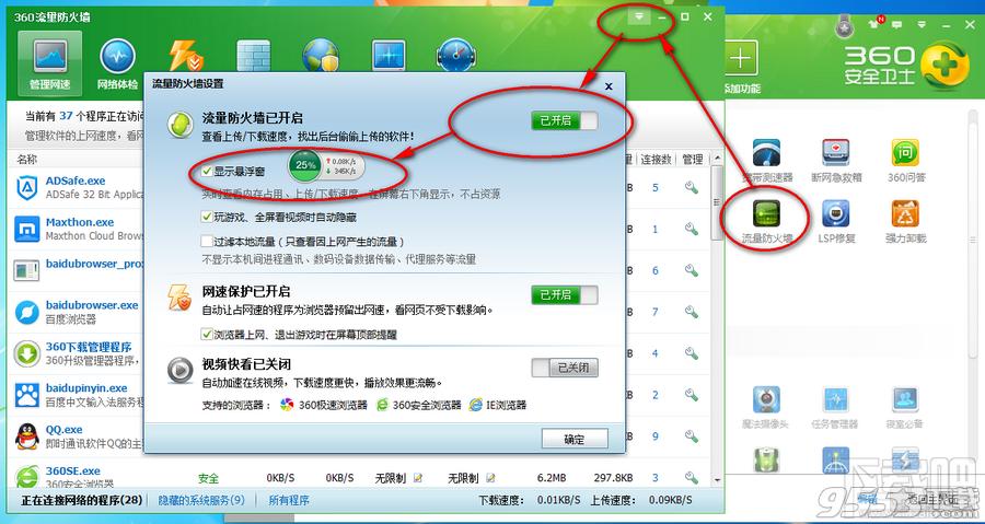 2、如果打开流量防火墙360加速球没有自动打开,那么在点击流量防火墙右上角的设置按钮,然后【开启】和【显示】360加速球。