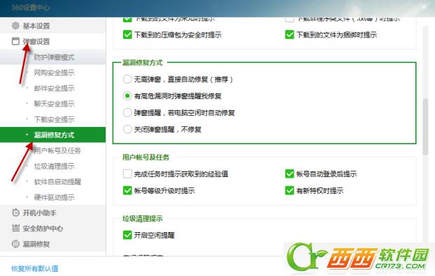 2、打开设置后,我们在左边的设置列表中找到“弹窗设置”,点击后会展开详细设置列表,我们选中“漏洞修复方式”