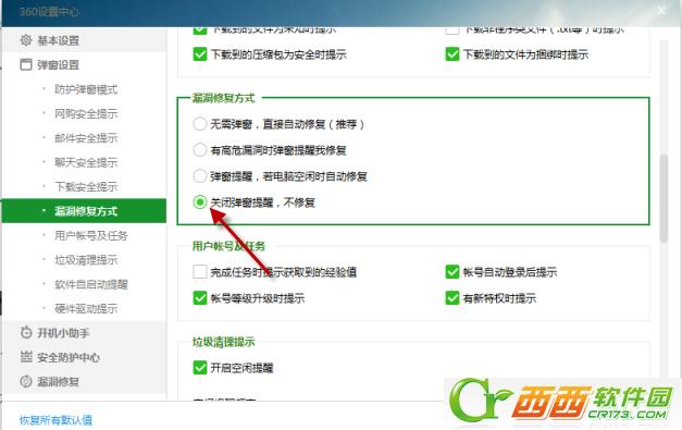 3、然后在右侧窗口选择“关闭弹窗提醒,不修复”,最后确定就可以了