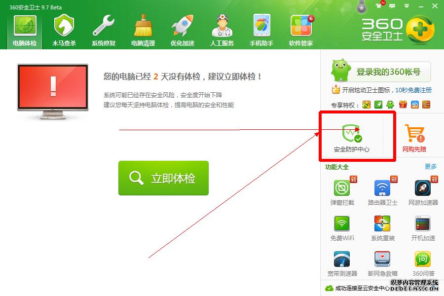 1、如果你的电脑中安装的360安全卫士最新版本,在主界面会有一个安全防护中心,如下图所示: