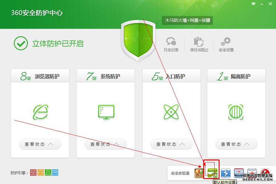 2、我们点击进入安全防护中心,然后安全实验室第二个选择默认软件设置,点击进入。如下图所示: