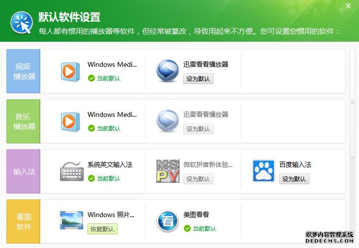 3、接下来会弹出默认软件设置窗口,在这里可以查看到你电脑中一些默认的视频、音乐、输入法、浏览器的当前默认的软件,你完全可以根据自己的需要进行默认软件的设置。
