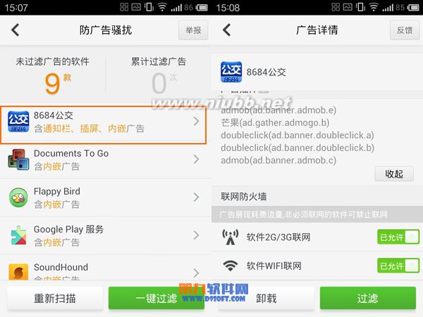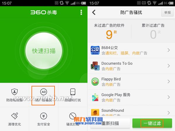 在手机上安装360手机杀毒软件,在360手机杀毒软件中选择“防广告骚扰”。进入后,360手机杀毒会帮助用户扫描手机上的软件,经过扫描后会显示内嵌广告的软件,想方便的用户可以点击“一键过滤”过滤掉软件里的广告。