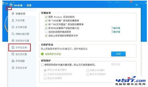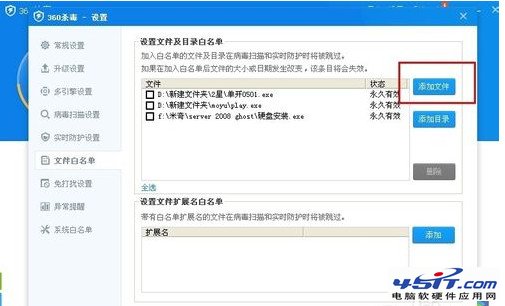 第二步:在“360杀毒-设置”界面中点击“文件白名单”,