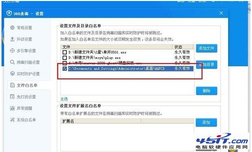 第六步:这时在“360杀毒-设置”“文件白名单”中就可以看到添加的文件了,然后点击“确定”按钮。