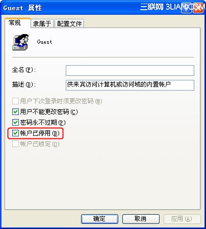 6)在弹出的用户属性对话框中,清除“帐户已停用”左侧的检查框,然后点击【确定】按钮。