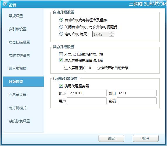 设置完成后可前往客户端电脑上的360杀毒进行验证,打开360杀毒的“设置”对话框,并选择“升级设置”,即可看到代理服务器设置: