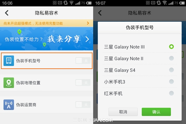 打开“隐私易容术”后,选择“伪装手机型号”,但在使用易容术之前,用户需要开启360的强劲模式,即ROOT。在伪装手机型号中,用户可以把自己的手机伪装成三星、红米等其他手机。
