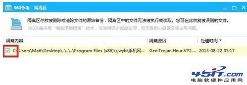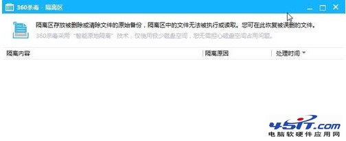 第三步:点击隔离区按钮打开隔离区的界面,你会发现被误杀的软件或程序就在里面。