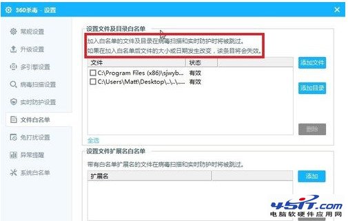 注意 :需要注意一下的是设置——白名单设置中有这么一句话,如果加入白名单的文件大小或日期发生改变,该条目自动失效哦。所以如果更新了的话,很明显你还得操作一次。
