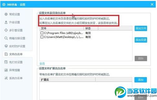 注意 :需要注意一下的是设置——白名单设置中有这么一句话,如果加入白名单的文件大小或日期发生改变,该条目自动失效哦。所以如果更新了的话,很明显你还得操作一次。