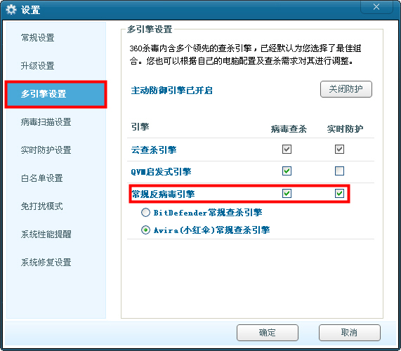 360杀毒3.0版本默认不安装本地引擎病毒库,如果您想使用本地引擎,请点击主界面右上角的"设置",打开设置界面后点"多引擎设置",然后勾选上常规反病毒引擎查杀和防护,您可以根据自己的喜好选择Bitdifender或Avira常规查杀引擎,选择好了之后点确定按钮: