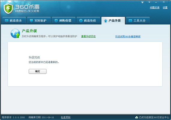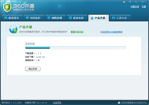 360杀毒具有自动升级功能,如果您开启了自动升级功能,360杀毒会在有升级可用时自动下载并安装升级文件。自动升级完成后会通过气泡窗口提示您: