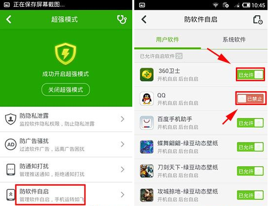 3、在超强模式中,我们可以看到“防软件自启”这一选项,点击进去,然后在自启软件的右边选择“已允许”,禁止自启的软件中选择“已禁止”就可以了。