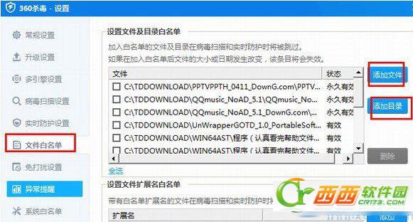 第二步、在360杀毒设置窗口中,选择文件白名单,根据需要点击右侧的【添加文件】或者【添加目录】进行添加,最后点击确定即可。