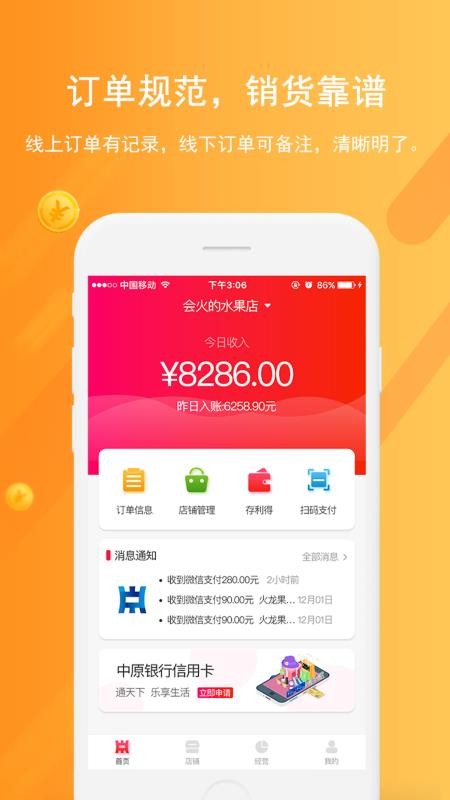 2、在首页中查看各种消息通知内容,快速了解店铺的各种收款信息,掌握店铺收入情况