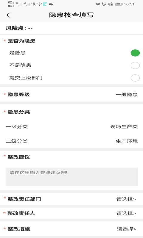4、进入隐患核查填写版块,快速选择隐患等级和分类,给出整改建议