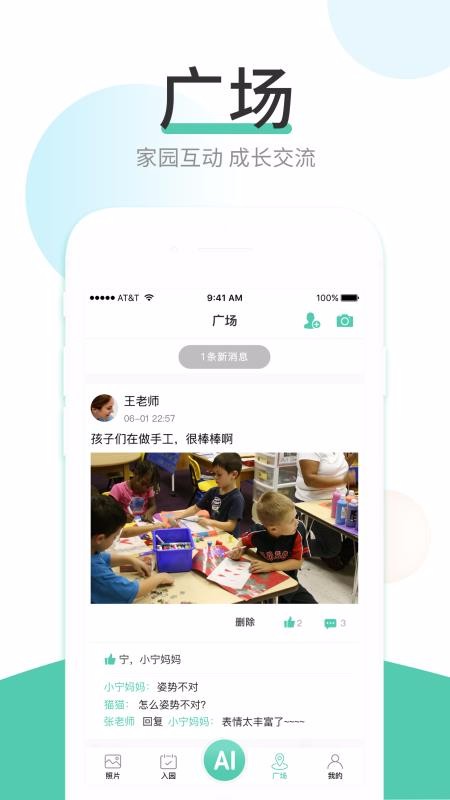 4、拥有专门的互动广场,家园互动,关注孩子的成长并进行交流,自行管理发布的动态;