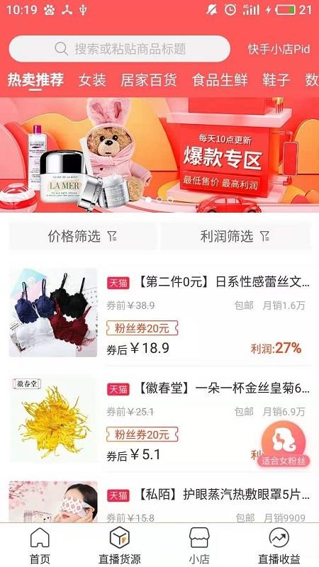 3、点击直播货源,查看各种推荐商品的利润信息,对商品进行筛选