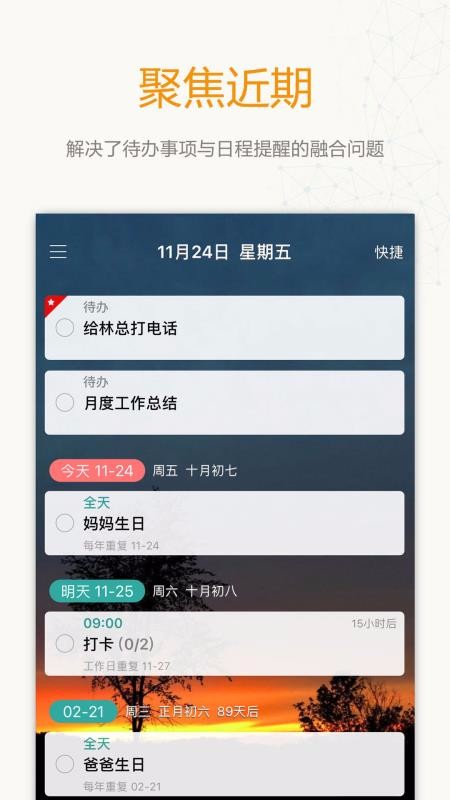 时间表是一款高效又好用的日程管理软件,可以用在生活中的时间管理,日常记事以及办公方面的各种日程待办事项的记录与提醒设置;聚焦展示近期中的日程信息提醒标签,能对近期需要办理或即将到来的倒计时纪念日一目了然,能看到今天自己是否需要给某位同事打电话,向该同事通知某个工作上的事情,也能看到今天是不是自己哪一个亲人的生日,及时做好生日的礼物准备;用户可以在里面将每天生活中各种需要重复操作的事情记录,比如每天上班之前设置一个大卡的提醒,以免自己会忘记需要打卡的任务,避免因为忘记打卡而被扣掉工资。
