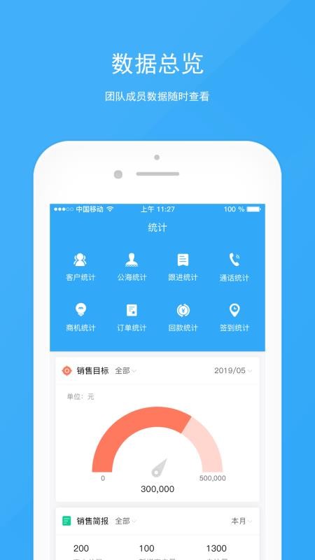5、进入统计界面,了解销售目标和销售简报,查看各种统计信息