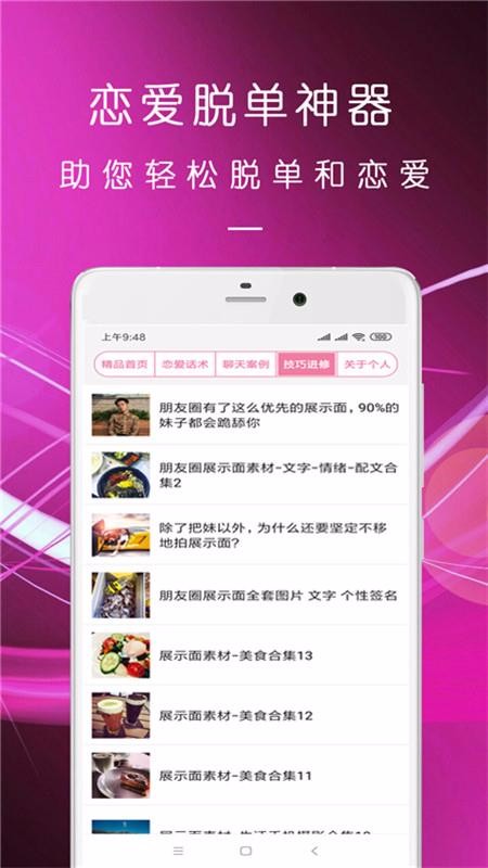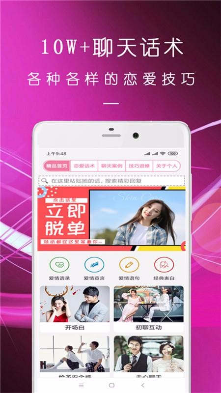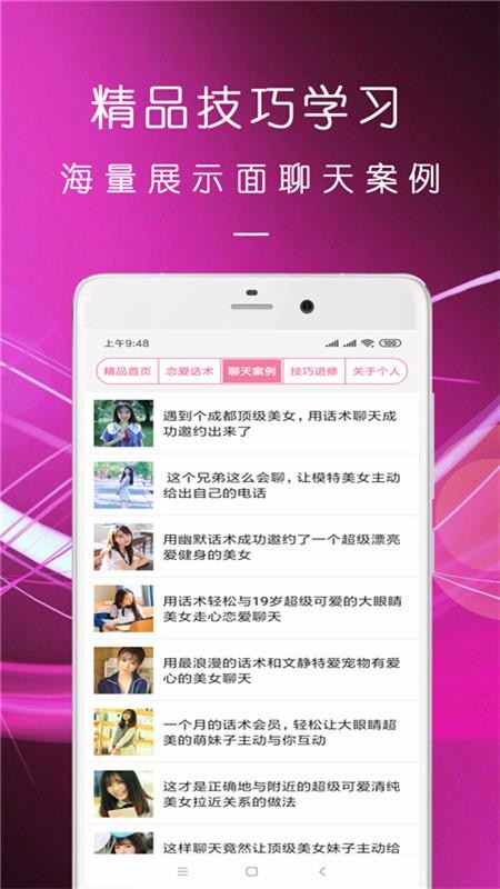 1、拥有超多聊天话术,为你提供各种各样的恋爱技巧,适合各个恋爱阶段;