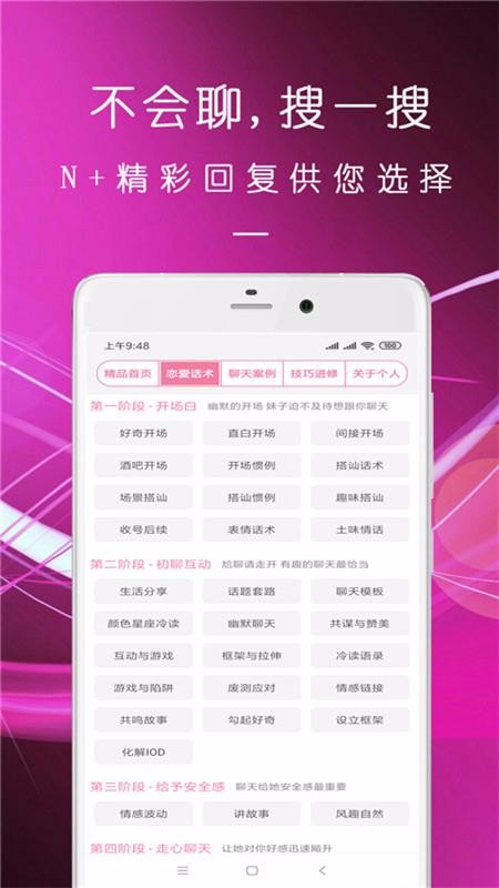 3、进入恋爱话术页面,按照阶段和分类查看推荐的聊天话术