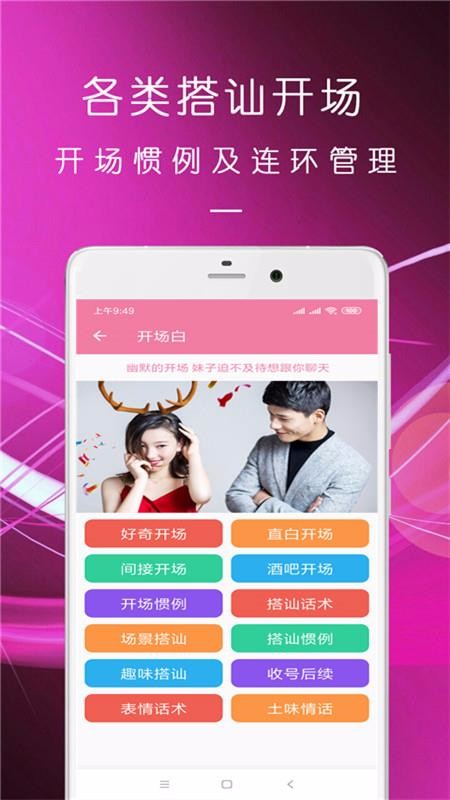2、拥有各类搭讪开场,包括开场惯例和连环管理,比如有好奇开场、直白开场、间接开场等;