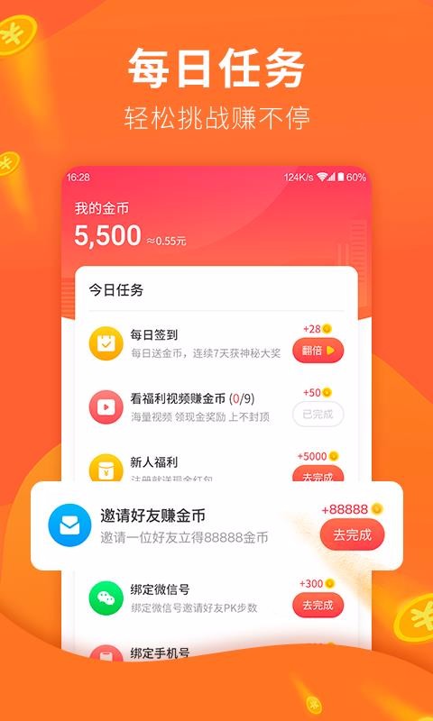 1、在线即可实现健康运动换金币,轻松进行走路赚钱,直接将步数兑换成金币;