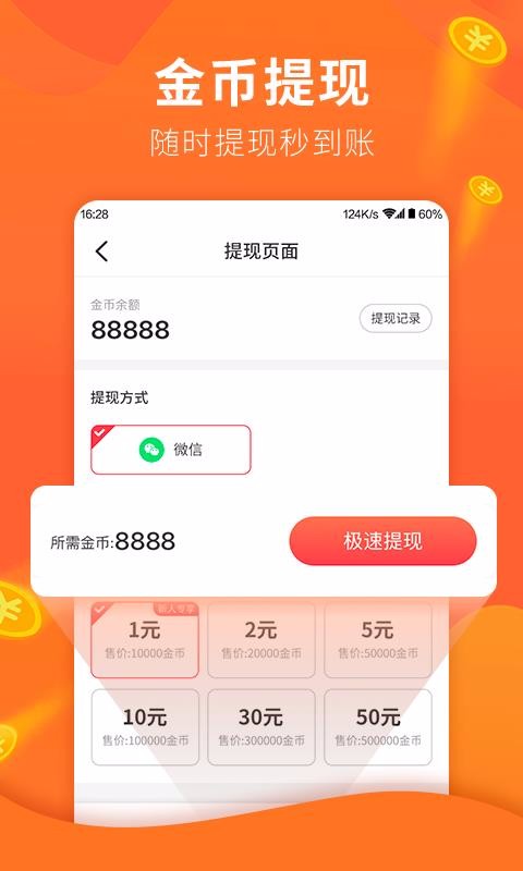 2、随时随地进行金币提现,提现速度快,秒到账,也没有手续费;