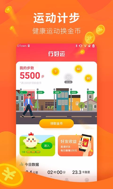 行好运是一个计步运动软件,并配合各种挑战活动,让用户在运动过程中可以获得奖励,同时可以让用户养成健康的好习惯;自动统计并显示今日步数,完成步数目标之后即可领取金币奖励,相应的可以查看今日数据,包括公里数、时长和消耗的卡路里;拥有各种金币任务,每日更新任务信息,完成任务即可获得金币收入,同时观看相关视频后,即可让奖励翻倍;为用户提供了专门的好运农场,在线即可实现养鸡和种树,通过浇水的形式,让树不断成长,可以收获金币果实,相应的也可以喂鸡,获得金蛋后即可砸开,随机出现不同额度的奖励,让获得奖励的过程更加趣味十足。