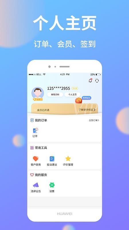 3、为用户提供详细快捷个人功能服务,包括订单、常用工具和签到等;
