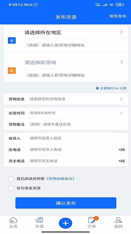 1、快速发布自己的货源信息,点击主功能栏加号就能立即完善货源信息并发布;