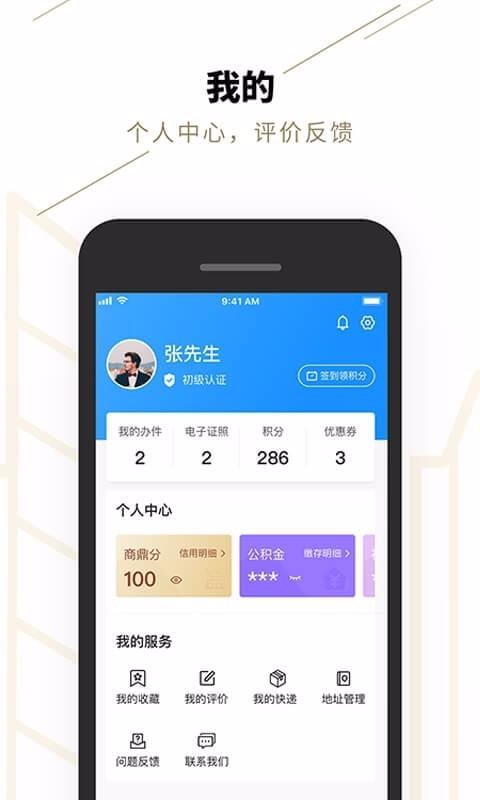 6、个人中心显示自己清晰丰富办件数据,数据栏中有我的办件、电子证照以及积分与优惠券的数量;