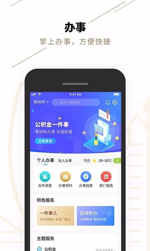 郑好办是一款便利的掌上政务办理移动工具,可以在这里查询公积金、社保,还能办理新生儿登记、人才补贴以及税务服务等内容;如果用户不是本地居民,又需要在郑州读书以及工作的话,就可以在居住证办理专栏中使用里面的办理工具来办理相应的居住证服务,不需要到社区以及政府就能快速完成在线办理操作;当用户购房后还能在契税补贴中申请相应的契税补贴服务,从该申请中获取自己应得的补贴福利,也可以在人才补贴中申请相应的人才补贴奖励;平台还为用户开设了资讯中心,可以在这里看到热点新闻、发布栏新闻以及城事和文体栏目的资讯内容。
