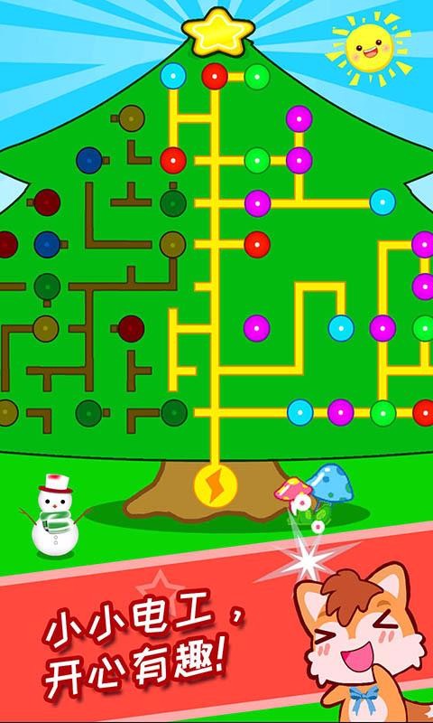 1、学习简单的电路应用图,在装扮圣诞树上的灯光时连接每一条电路,让灯光能全部亮起来;