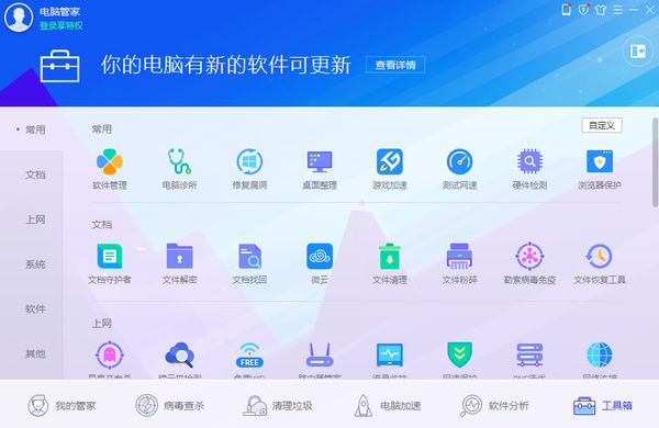 除了为用户解决病毒攻击的困扰,腾讯电脑管家一直在洞察用户切实的需求,致力于为用户打造便捷、高效的电脑使用环境。基于用户使用电脑的普遍需求,腾讯电脑管家集合众多电脑使用工具,为用户提供垃圾清理、电脑加速、软件管理、文档保护等系列服务,让用户日常办公更轻松。
