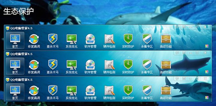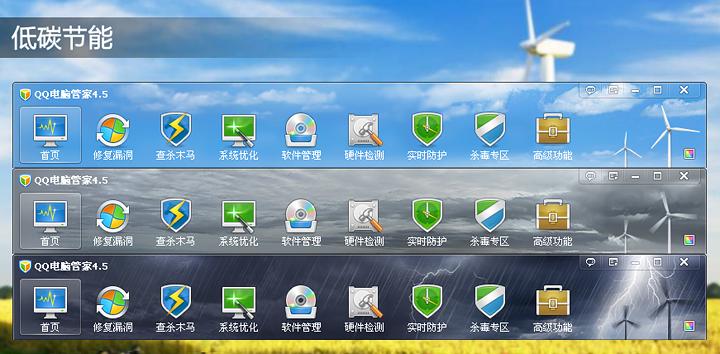 设计推动人类的进步。特别是在第三次工业革命之后,设计已成为产品社会化不可或缺的重要手段。人们更多的关注于设计带来的经济价值和生活便利性,而容易忽略了它的社会职能。在中国,腾讯软件拥有众多的使用者,因此我们希望,设计能够担负起改善用户体验的职责。但我们越发的意识到,仅解决用户使用中的问题还远不够,一款优秀的产品应该具备社会责任感,并能为用户提供更好的生活方式。于是,我们决定在QQ电脑管家的皮肤升级中进行“智能主题与社会责任”的尝试,让用户在使用新皮肤的同时,能够感受到更深层的含义。QQ电脑管家此次换肤改版也让皮肤效果不再是静态,会以主题的形式出现,结合环保概念,伴随风险等级而动态变化,直观反馈用户电脑的健康状况。