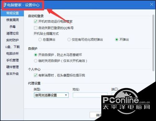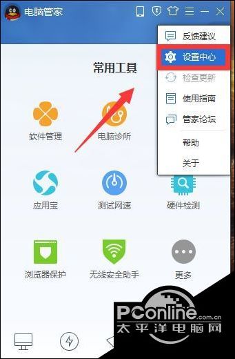2、打开腾讯电脑管家的“设置中心”,进入“电脑管家——设置中心”。